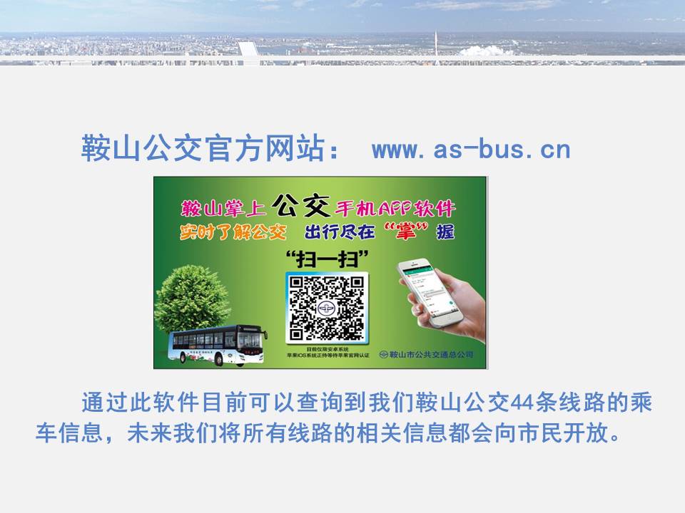 點(diǎn)點(diǎn)手機(jī)就可以看到公交車目前所在的位置,精準(zhǔn)地掐好出門時(shí)間,從而避免在惡劣天氣或高峰期苦苦候車,工作人員坐在調(diào)度室內(nèi)就能掌握車輛在路上的運(yùn)行情況……為方便廣大市民出行,基于安卓平臺(tái)開發(fā)的“鞍山掌上公交”官方APP將于11月15日正式上線試運(yùn)行,適用于蘋果IOS系統(tǒng)的APP將于明年初上線,市民可在公共交通總公司官網(wǎng)下載該軟件,并實(shí)現(xiàn)37條公交線路車輛實(shí)時(shí)查詢的便利服務(wù)。 近年來,市公交總公司借助“互聯(lián)網(wǎng)+公交”發(fā)展理念,以創(chuàng)建國(guó)家低碳環(huán)保示范城市為契機(jī),大力推進(jìn)智能公交建設(shè),目前已在56條公交線路實(shí)現(xiàn)了GPS調(diào)度指揮,可實(shí)現(xiàn)車輛實(shí)時(shí)監(jiān)控,運(yùn)營(yíng)趟次查詢、行車計(jì)劃查詢、超速查詢等29項(xiàng)報(bào)表查詢分析功能,極大地提高了車輛利用率及企業(yè)管理科學(xué)化水平。智能公交的廣泛應(yīng)用不但讓市民出行更加便捷,也讓公交從業(yè)人員的工作更輕松。