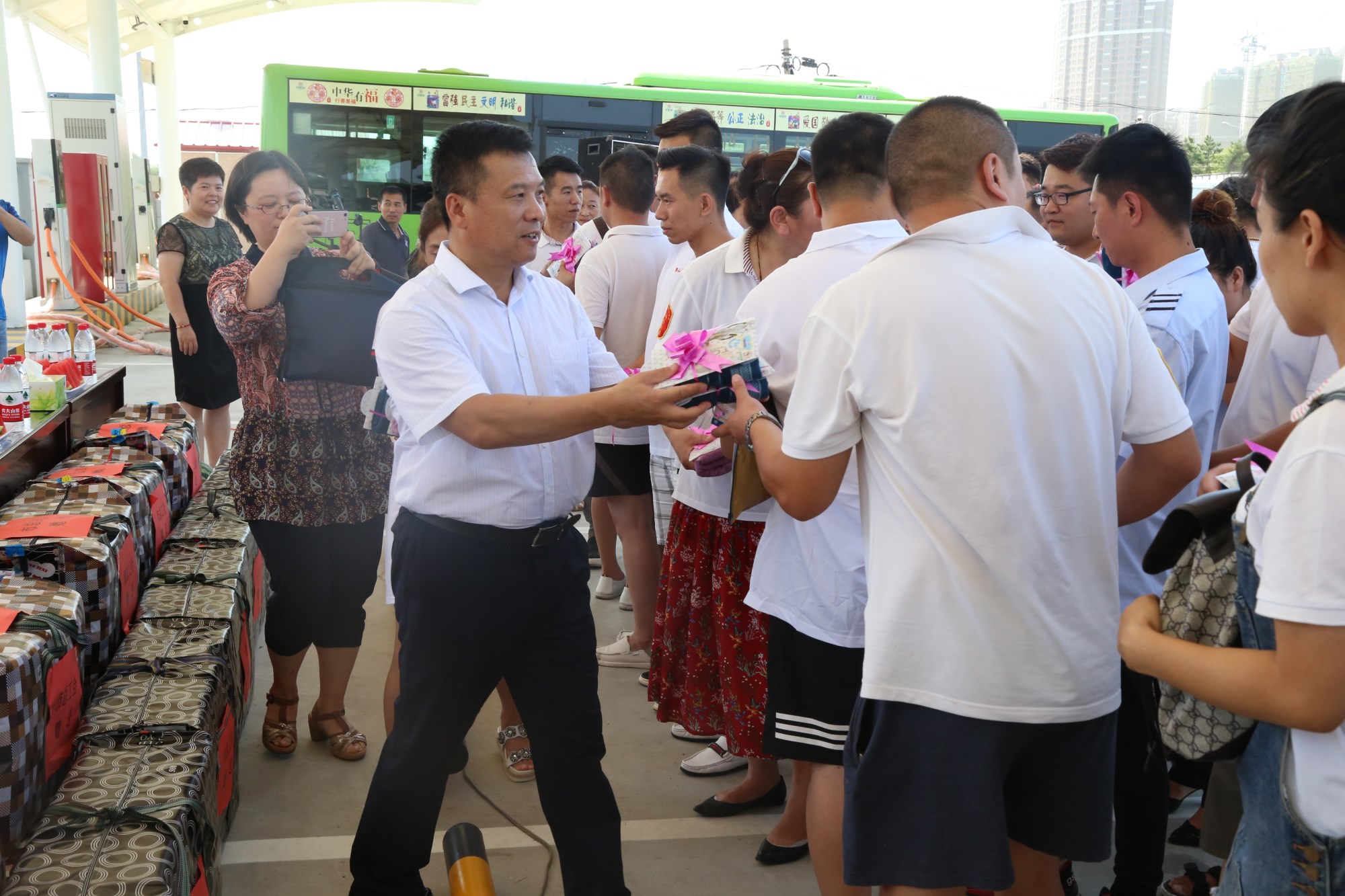 2018年8月1日下午,鞍山市總工會在交運(yùn)集團(tuán)第二汽車分公司216路終點(diǎn)站舉行了為公交一線駕駛員送清涼活動(dòng)。鞍山市人大常委會副主任、市總工會主席解永孚;市總工會副主席李展程;市國資委黨委書記、主任顧洪新等領(lǐng)導(dǎo)來到216路調(diào)度室看望了交運(yùn)集團(tuán)一線駕駛員,為他們送去夏日里的清涼與工會組織的慰問。交運(yùn)集團(tuán)黨委書記、董事長羅玉艷;總經(jīng)理王春江;黨委副書記、紀(jì)委書記、工會主席金秀石出席了活動(dòng);顒(dòng)中,交運(yùn)集團(tuán)黨委書記、董事長羅玉艷向市總工會領(lǐng)導(dǎo)介紹了企業(yè)生產(chǎn)運(yùn)營情況,并代表集團(tuán)職工向市總工會表示感謝。隨后,市總工會主席解永孚代表市總工會對高溫酷暑中仍堅(jiān)守崗位、辛勤工作的交運(yùn)一線職工致以親切的問候,希望交運(yùn)集團(tuán)廣大職工繼續(xù)發(fā)揚(yáng)艱苦奮斗、愛崗敬業(yè)精神,注意防暑和行車安全,以更好的狀態(tài)投入到工作中服務(wù)好市民乘客,并將市總工會撥付的2萬元慰問金交到交運(yùn)集團(tuán)董事長手中。第二汽車分公司2路線駕駛員謝金紅在活動(dòng)中代表一線駕駛員作了表態(tài)發(fā)言。最后,各級領(lǐng)導(dǎo)在現(xiàn)場親手將交運(yùn)集團(tuán)工會為一線職工準(zhǔn)備了冰袖、毛巾、西瓜、冰鎮(zhèn)礦泉水等慰問物資發(fā)到職工手中。